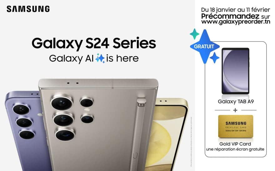 وسيستفيد حرفاء سامسونج في تونس الذين يطلبون مسبقاً من سلسلة S24 الجديدة من عدة مزايا إضافية تتضمن Galaxy Tab A9 وبطاقة ذهبية لإصلاح الشاشة مرّة واحدة مجانًا وصالحة لمدّة سنة.
